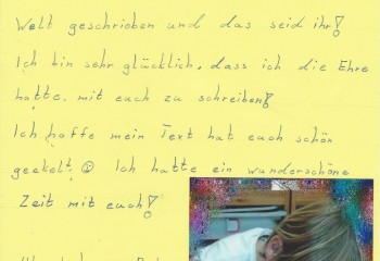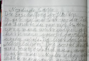 Die Texte, die Sie hier sehen, sind in einer festen Schreibzeit in einem Tage- bzw. Schreibbuch entstanden - oft spontan und intuitiv. Es sind erste, nicht-bearbeitete Textentwürfe, die ohne Vorgaben verfasst wurden. Die so entstehenden freien und individuell bedeutsamen Texte zeigen, wie durch das Schreiben das Leben der Lernenden im Schulalltag Raum erhält. Bedenken Sie, dass keiner dieser Texte rechtschriftlich korrigiert ist. Eine rechtschriftliche Korrektur erfolgt, wenn ein Text veröffentlicht wird (s. Präsentationstexte). Fehlerhafte Schreibweisen sind Anlass für individuelle Übungen (s. Rechtschreiben).